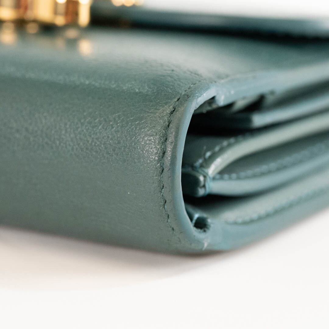 This compact tri-fold wallet elegantly showcases CELINE’s signature “Triumph” motif.